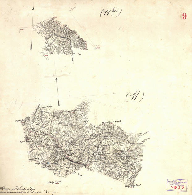 "Rilievi disegnati a penna su carta da disegno montata su tela, sono 23 spezzoni di confine su 12 tavole realizzati nel 1913 dalla Commissione Italo - Austriaca per la delimitazione dei confini Nord - Orientali dell' Albania."