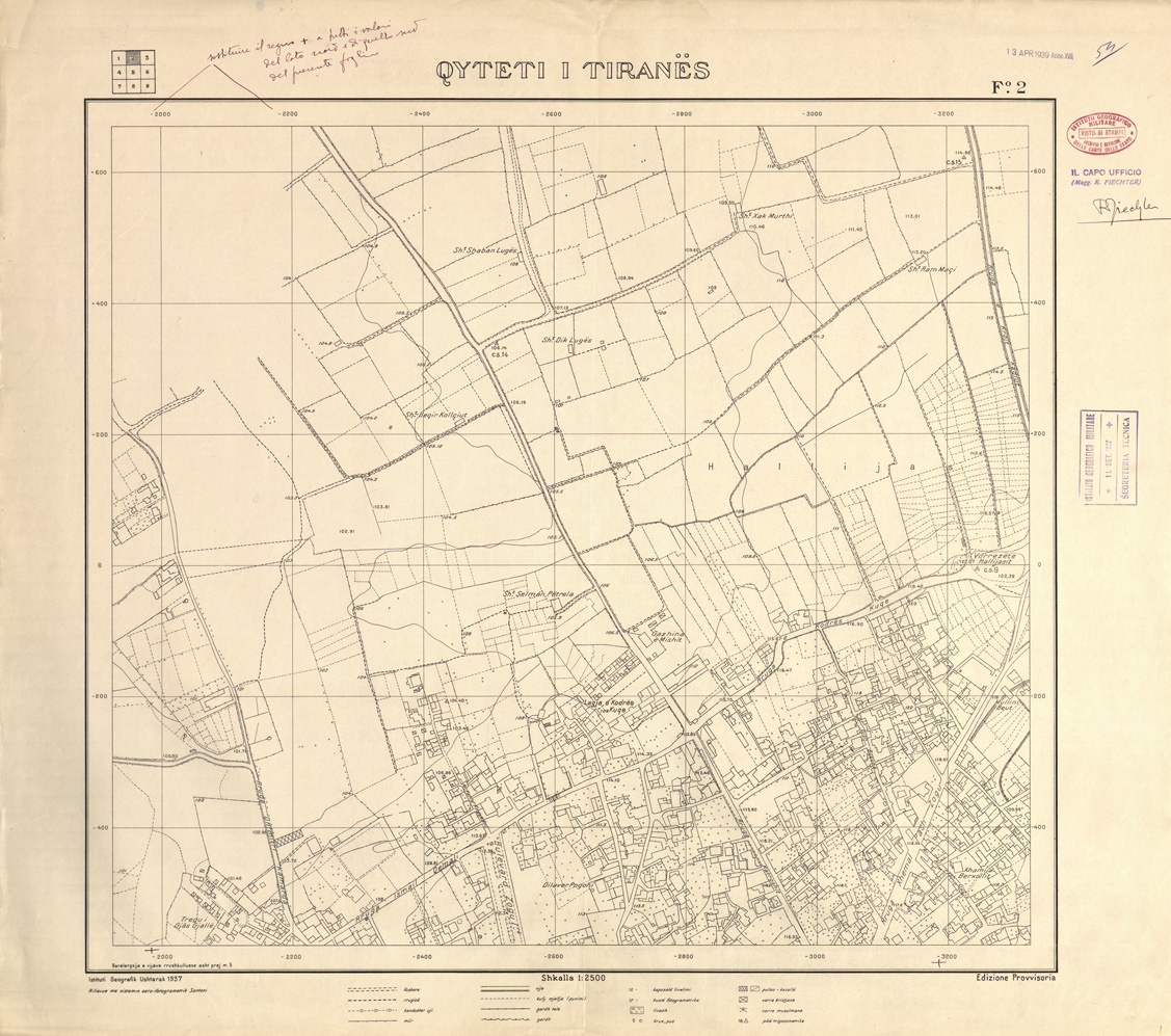 "Carta realizzata su richiesta del Ministero dei Lavori Pubblici del Regno di Albania allo scopo di compilare un piano regolatore della Città. Dagli stessi rilievi sono state realizzate 2 carte della zona della Villa Reale alla scala di 1:1.000 e 1:5.000 ( stesso categorico ) e una Pianta di Tirana alla scala di 1:5.000 in foglio unico ( File SE006310 )"