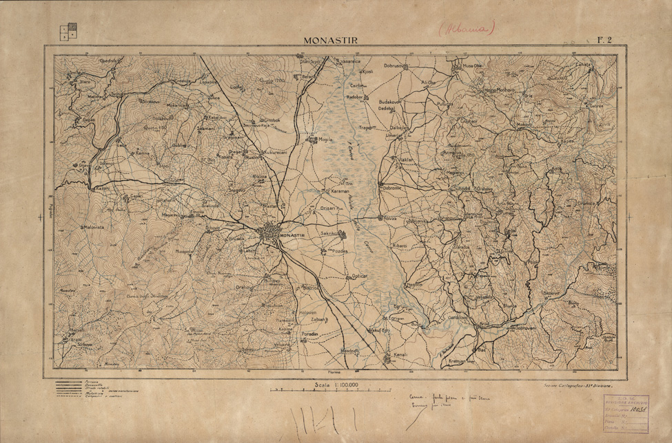 "Carta realizzata dalla Sezione Cartografica della 35° Divisione in Macedonia usando come fonti di compilazione rilievi Italiani e Francesi alla scala di 1:20.000 e varie carte Tedesche."