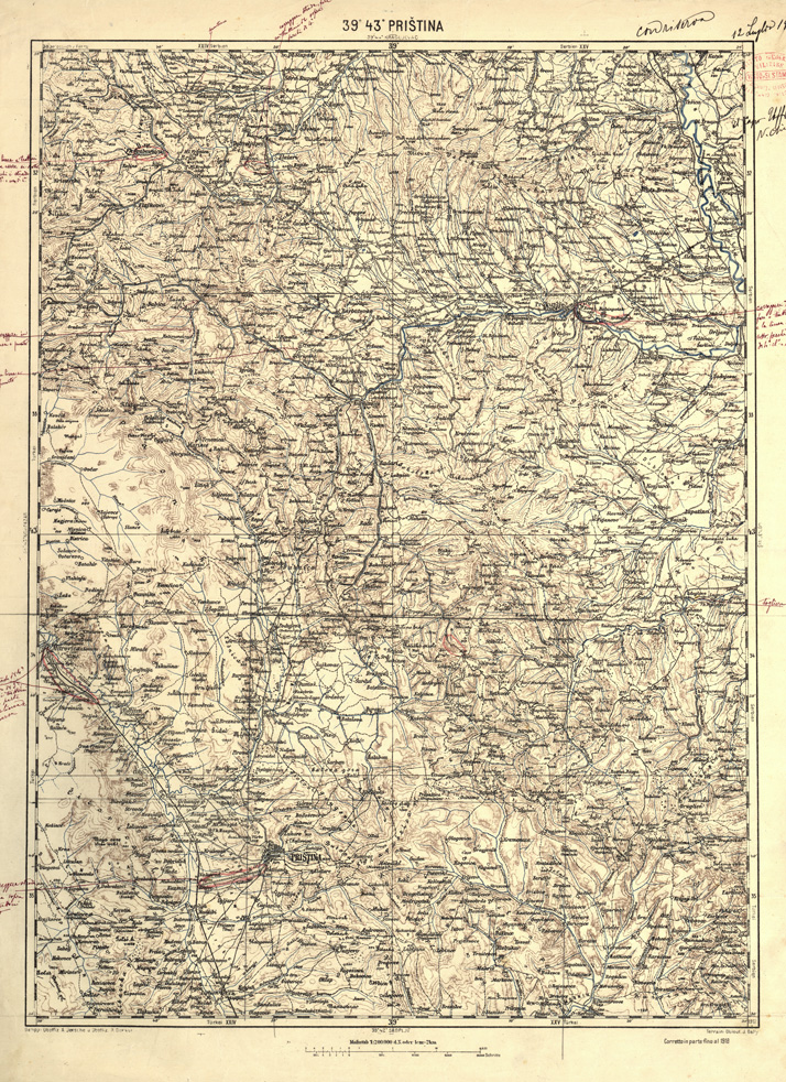"Carta austriaca, stampa I.G.M. 1927, rappresentazione orografica a sfumo, stampa 5 colori. Allegato inserto di lucidi con aggiornamenti in varie date: ( 1911 1918 1923 ) ed uno di Durazzo allestito nel 1940."