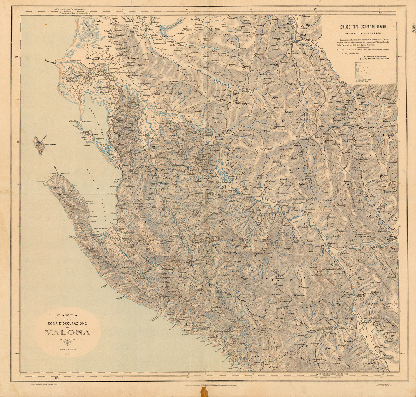 "Carta realizzata dalla Sezione Cartografica del Comando Truppe d' Occupazione dell' Albania con i rilievi speditivi alla scala di 1:50.000 e 1:100.000 eseguiti durante l' occupazione stessa e in parte con l' ingrandimento della carta dell' Europa centrale alla scala di 1 :200.000 dell ' Istituto Geografico Militare Austriaco."