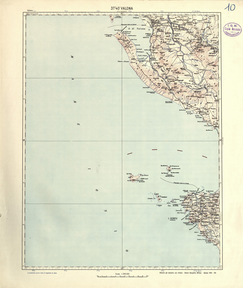 "Carta dell'Albania e Grecia al 200.000 stampa del 1940 4 colori equidistanza delle curve m. 100"