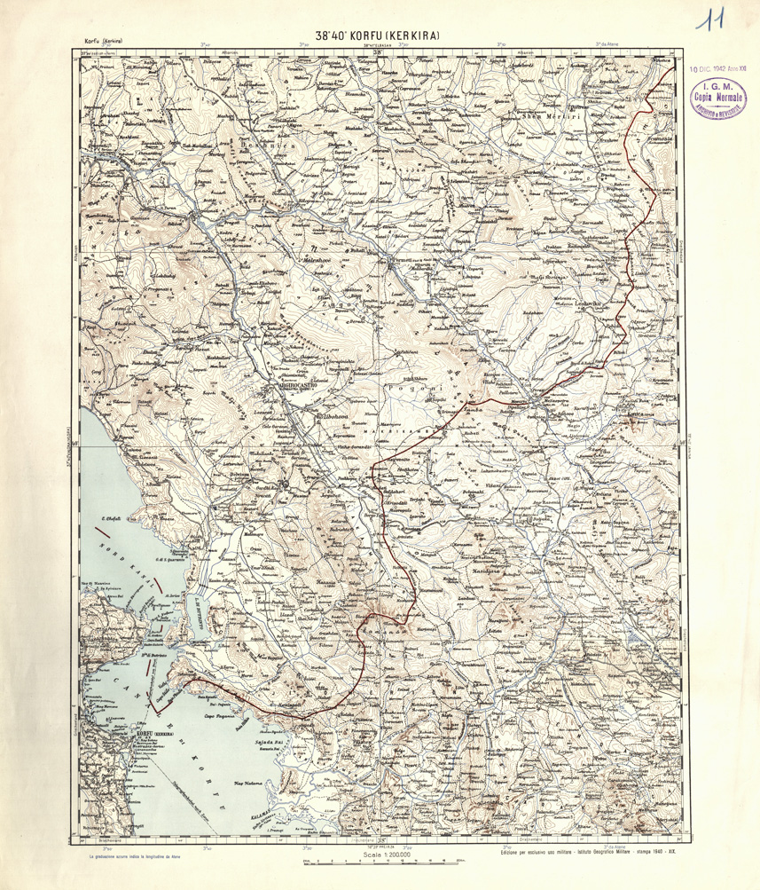 "Carta dell'Albania e Grecia al 200.000 stampa del 1940 4 colori equidistanza delle curve m. 100"