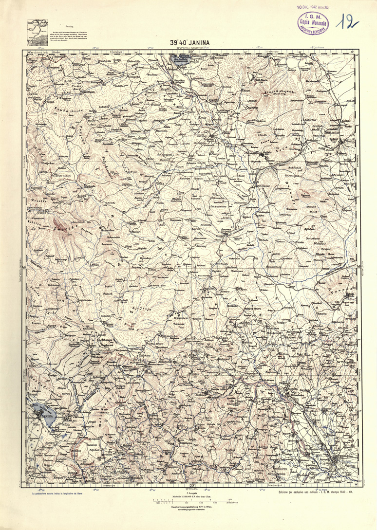 "Carta dell'Albania e Grecia al 200.000 stampa del 1940 4 colori equidistanza delle curve m. 100"