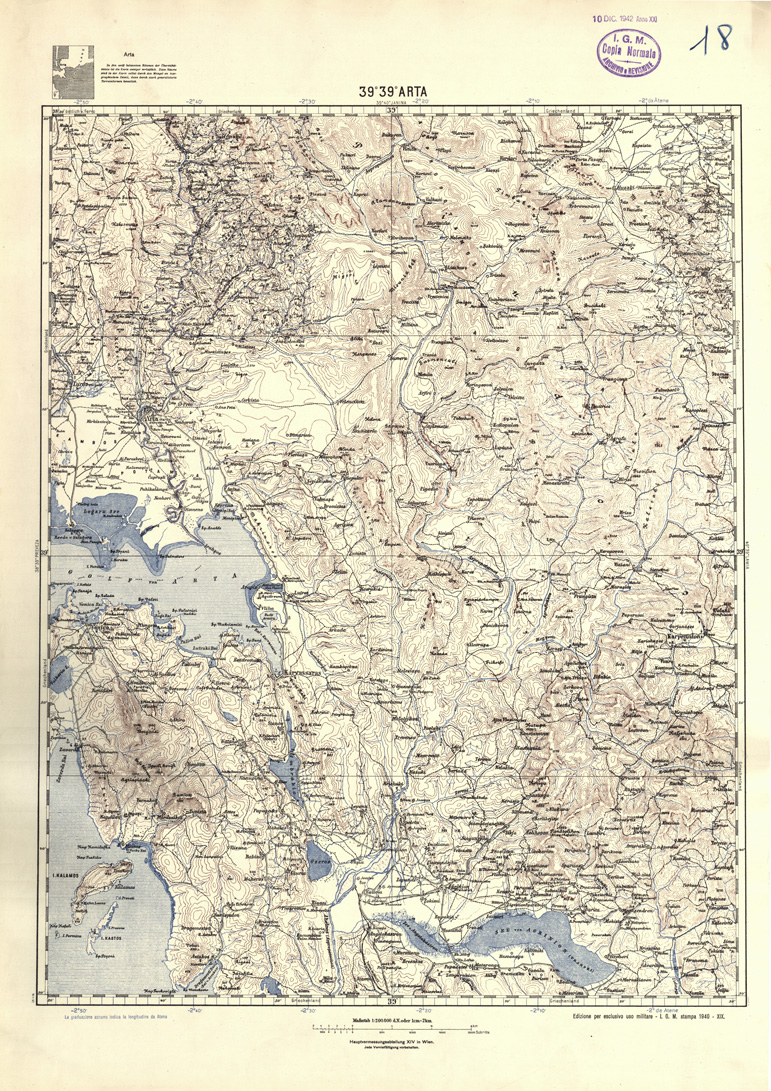 "Carta dell'Albania e Grecia al 200.000 stampa del 1940 4 colori equidistanza delle curve m. 100"