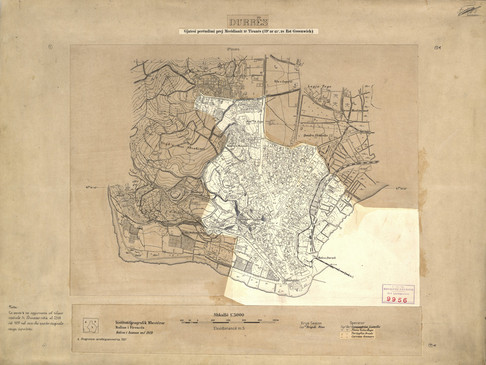 "Rilievo ottenuto mediante riduzione fotomeccanica dei rilievi alla scala di 1:2.500 del 1928 e aggiornato nel 1937 con una nuova ricognizione aerofotogrammetrica per il solo territorio dei dintorni di Durazzo."
