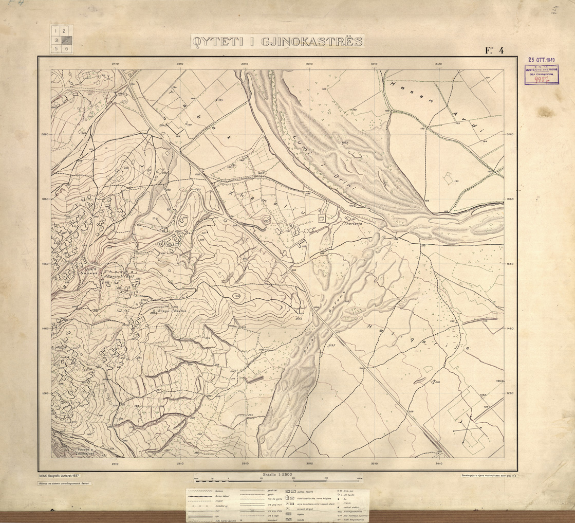 "Rilievo eseguito dall' IGM e facente parte di un vasto programma di rilevamento aerofotogrammetrico a grande scala dei principali centri urbani Albanesi."