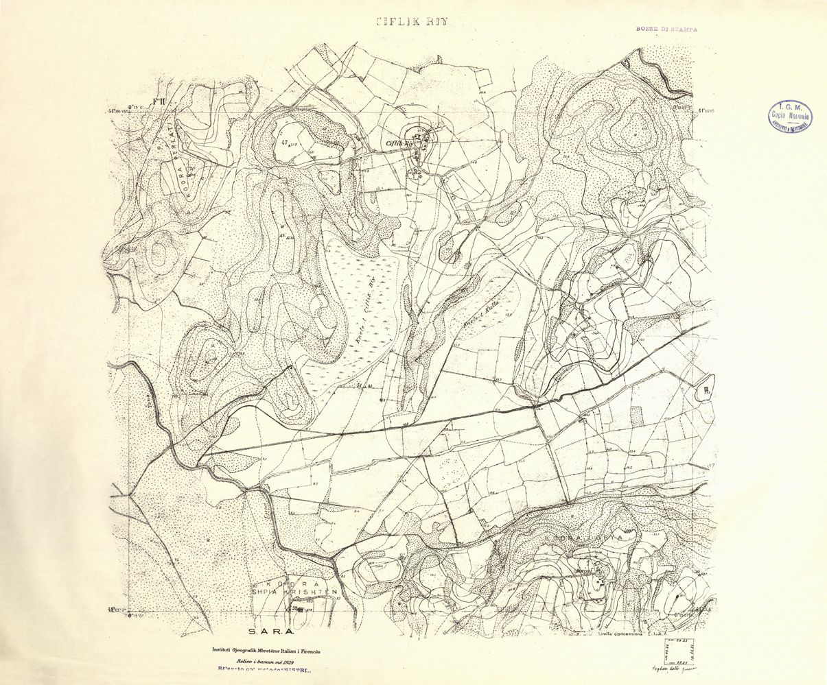 "Rilievi alla scala di 1:5.000 eseguiti a scopo catastale per conto del Ministero delle Finanze Albanese negli anni 1927 1928 1929 in parte da operatori dell' IGM e in parte, nella zona di Shijak, dalla ditta S.A.R.A. di Roma, alcune zone di particolare importanza furono rilevate alla scala di 1:2.500 ( Shijak dalla ditta S.A.R.A. Durazzo e Valona dall' IGM )"