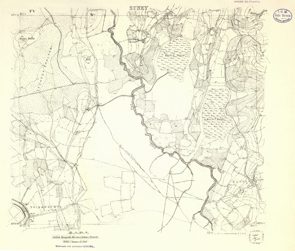 "Rilievi alla scala di 1:5.000 eseguiti a scopo catastale per conto del Ministero delle Finanze Albanese negli anni 1927 1928 1929 in parte da operatori dell' IGM e in parte, nella zona di Shijak, dalla ditta S.A.R.A. di Roma, alcune zone di particolare importanza furono rilevate alla scala di 1:2.500 ( Shijak dalla ditta S.A.R.A. Durazzo e Valona dall' IGM )"