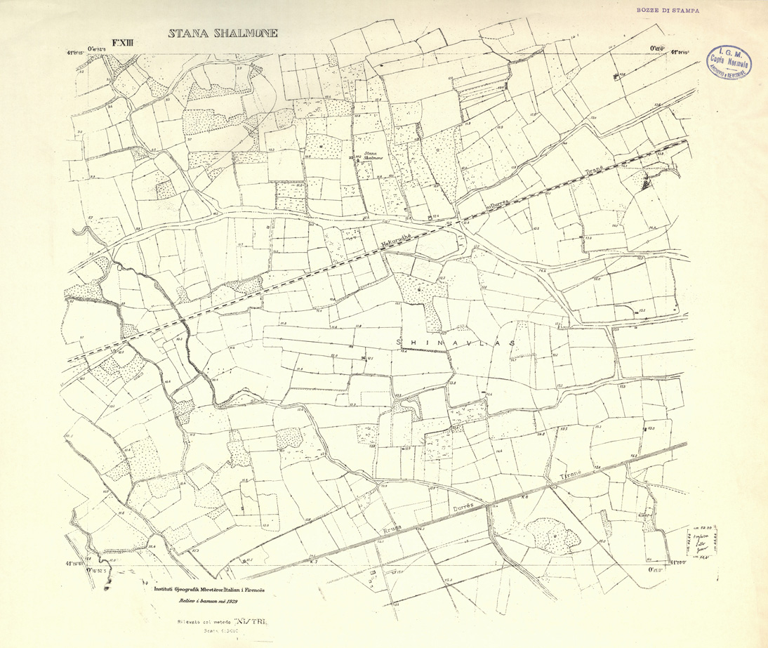"Rilievi alla scala di 1:5.000 eseguiti a scopo catastale per conto del Ministero delle Finanze Albanese negli anni 1927 1928 1929 in parte da operatori dell' IGM e in parte, nella zona di Shijak, dalla ditta S.A.R.A. di Roma, alcune zone di particolare importanza furono rilevate alla scala di 1:2.500 ( Shijak dalla ditta S.A.R.A. Durazzo e Valona dall' IGM )"