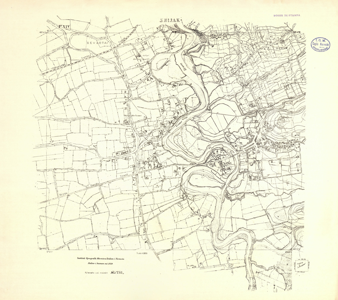 "Rilievi alla scala di 1:5.000 eseguiti a scopo catastale per conto del Ministero delle Finanze Albanese negli anni 1927 1928 1929 in parte da operatori dell' IGM e in parte, nella zona di Shijak, dalla ditta S.A.R.A. di Roma, alcune zone di particolare importanza furono rilevate alla scala di 1:2.500 ( Shijak dalla ditta S.A.R.A. Durazzo e Valona dall' IGM )"