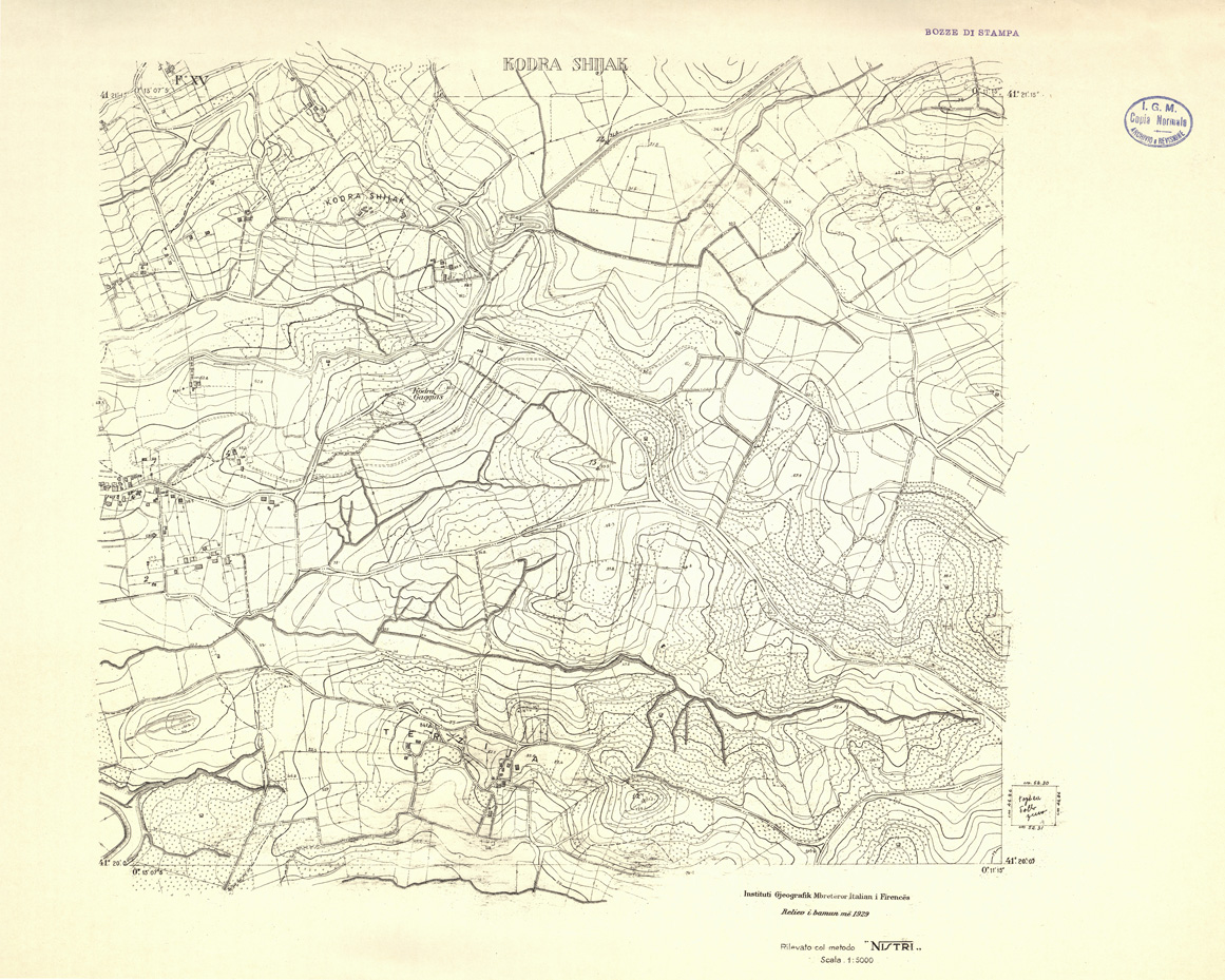 "Rilievi alla scala di 1:5.000 eseguiti a scopo catastale per conto del Ministero delle Finanze Albanese negli anni 1927 1928 1929 in parte da operatori dell' IGM e in parte, nella zona di Shijak, dalla ditta S.A.R.A. di Roma, alcune zone di particolare importanza furono rilevate alla scala di 1:2.500 ( Shijak dalla ditta S.A.R.A. Durazzo e Valona dall' IGM )"