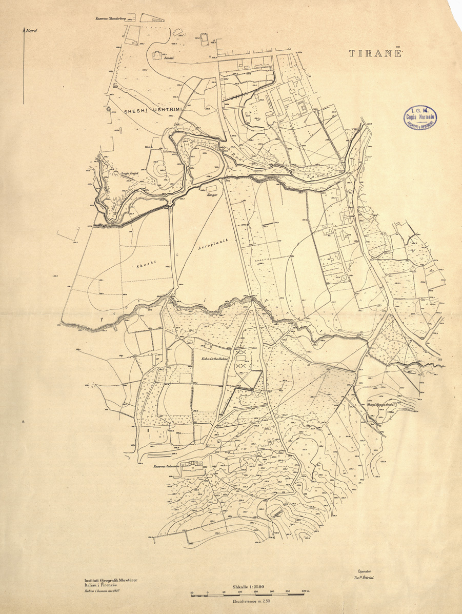 "Rilievi alla scala di 1:5.000 eseguiti a scopo catastale per conto del Ministero delle Finanze Albanese negli anni 1927 1928 1929 in parte da operatori dell' IGM e in parte, nella zona di Shijak, dalla ditta S.A.R.A. di Roma, alcune zone di particolare importanza furono rilevate alla scala di 1:2.500 ( Shijak dalla ditta S.A.R.A. Durazzo e Valona dall' IGM )"