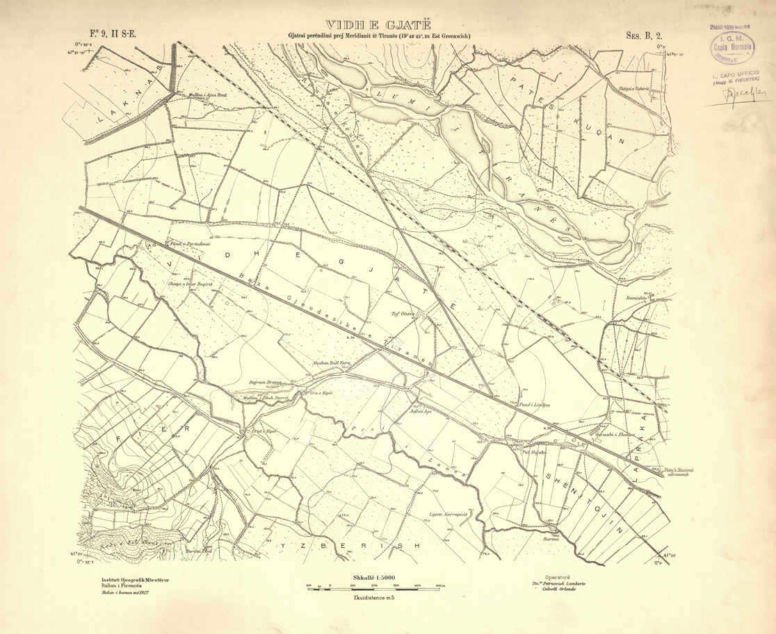 "Rilievi alla scala di 1:5.000 eseguiti a scopo catastale per conto del Ministero delle Finanze Albanese negli anni 1927 1928 1929 in parte da operatori dell' IGM e in parte, nella zona di Shijak, dalla ditta S.A.R.A. di Roma, alcune zone di particolare importanza furono rilevate alla scala di 1:2.500 ( Shijak dalla ditta S.A.R.A. Durazzo e Valona dall' IGM )"