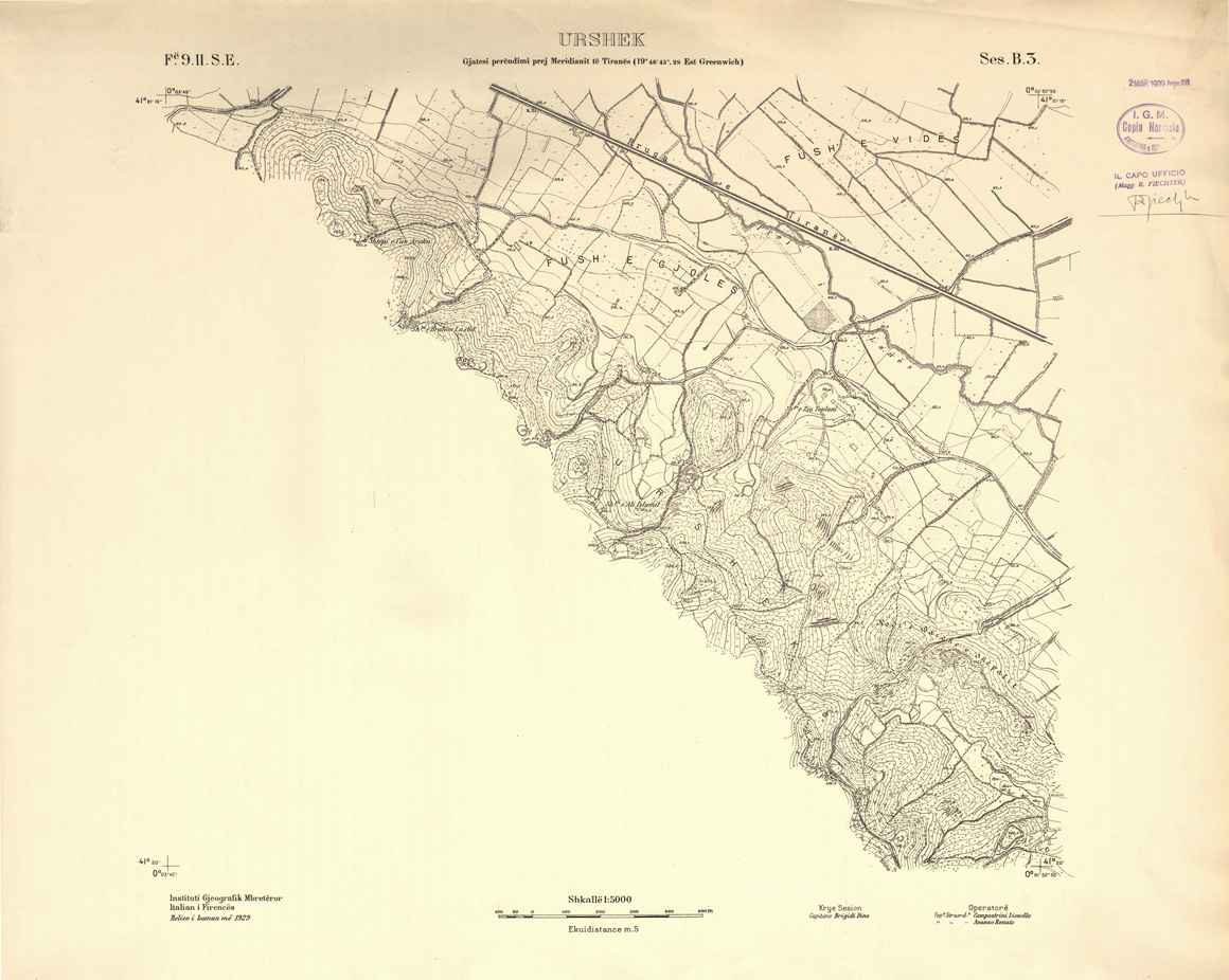 "Rilievi alla scala di 1:5.000 eseguiti a scopo catastale per conto del Ministero delle Finanze Albanese negli anni 1927 1928 1929 in parte da operatori dell' IGM e in parte, nella zona di Shijak, dalla ditta S.A.R.A. di Roma, alcune zone di particolare importanza furono rilevate alla scala di 1:2.500 ( Shijak dalla ditta S.A.R.A. Durazzo e Valona dall' IGM )"
