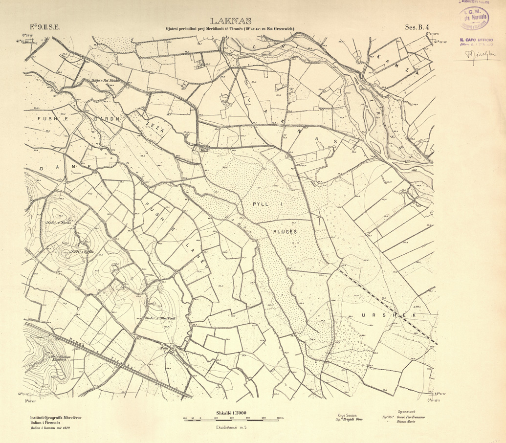 "Rilievi alla scala di 1:5.000 eseguiti a scopo catastale per conto del Ministero delle Finanze Albanese negli anni 1927 1928 1929 in parte da operatori dell' IGM e in parte, nella zona di Shijak, dalla ditta S.A.R.A. di Roma, alcune zone di particolare importanza furono rilevate alla scala di 1:2.500 ( Shijak dalla ditta S.A.R.A. Durazzo e Valona dall' IGM )"
