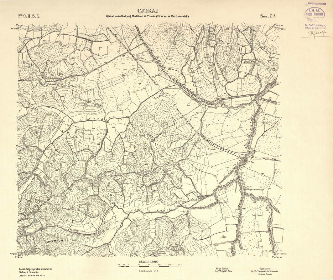 "Rilievi alla scala di 1:5.000 eseguiti a scopo catastale per conto del Ministero delle Finanze Albanese negli anni 1927 1928 1929 in parte da operatori dell' IGM e in parte, nella zona di Shijak, dalla ditta S.A.R.A. di Roma, alcune zone di particolare importanza furono rilevate alla scala di 1:2.500 ( Shijak dalla ditta S.A.R.A. Durazzo e Valona dall' IGM )"
