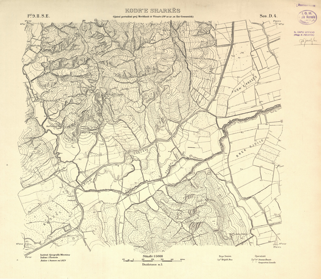 "Rilievi alla scala di 1:5.000 eseguiti a scopo catastale per conto del Ministero delle Finanze Albanese negli anni 1927 1928 1929 in parte da operatori dell' IGM e in parte, nella zona di Shijak, dalla ditta S.A.R.A. di Roma, alcune zone di particolare importanza furono rilevate alla scala di 1:2.500 ( Shijak dalla ditta S.A.R.A. Durazzo e Valona dall' IGM )"