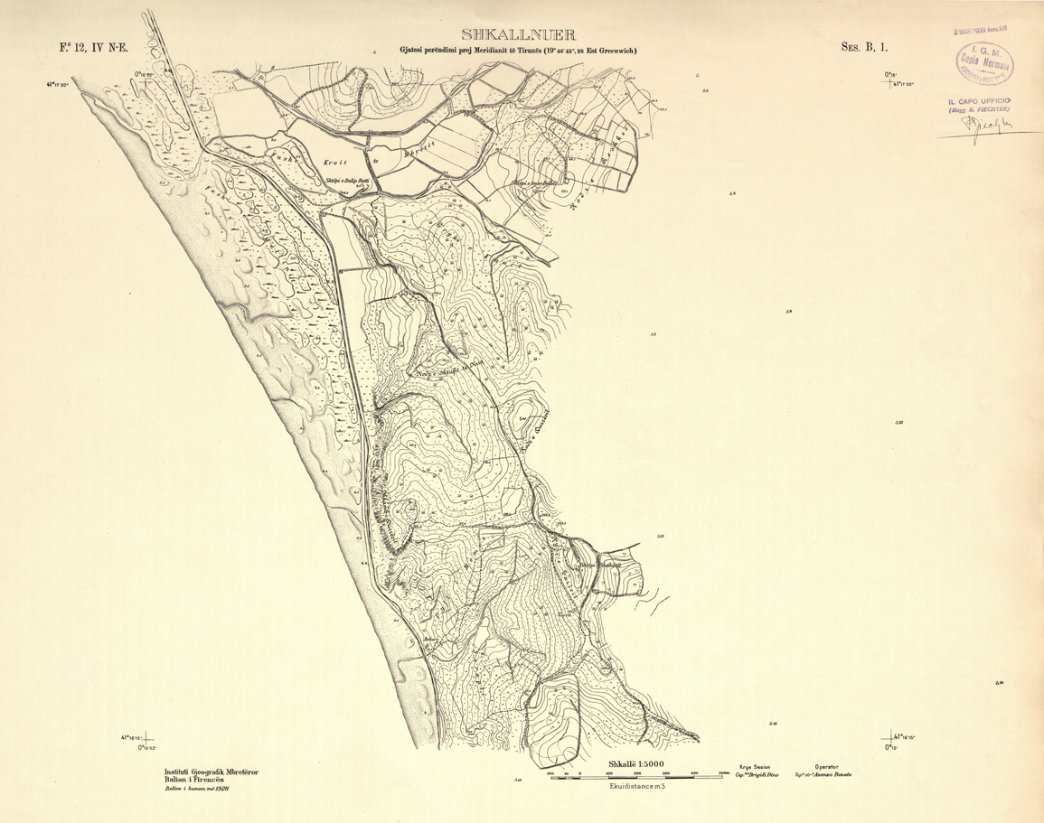 "Rilievi alla scala di 1:5.000 eseguiti a scopo catastale per conto del Ministero delle Finanze Albanese negli anni 1927 1928 1929 in parte da operatori dell' IGM e in parte, nella zona di Shijak, dalla ditta S.A.R.A. di Roma, alcune zone di particolare importanza furono rilevate alla scala di 1:2.500 ( Shijak dalla ditta S.A.R.A. Durazzo e Valona dall' IGM )"