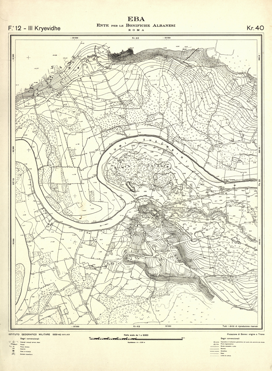 "Rilievi effettuati dall' IGM negli anni dal 1939 al 1943 per conto dell' Ente per le Bonifiche Albanesi istituito dal Ministero Esteri - Sottosegretariato Affari Albanesi."