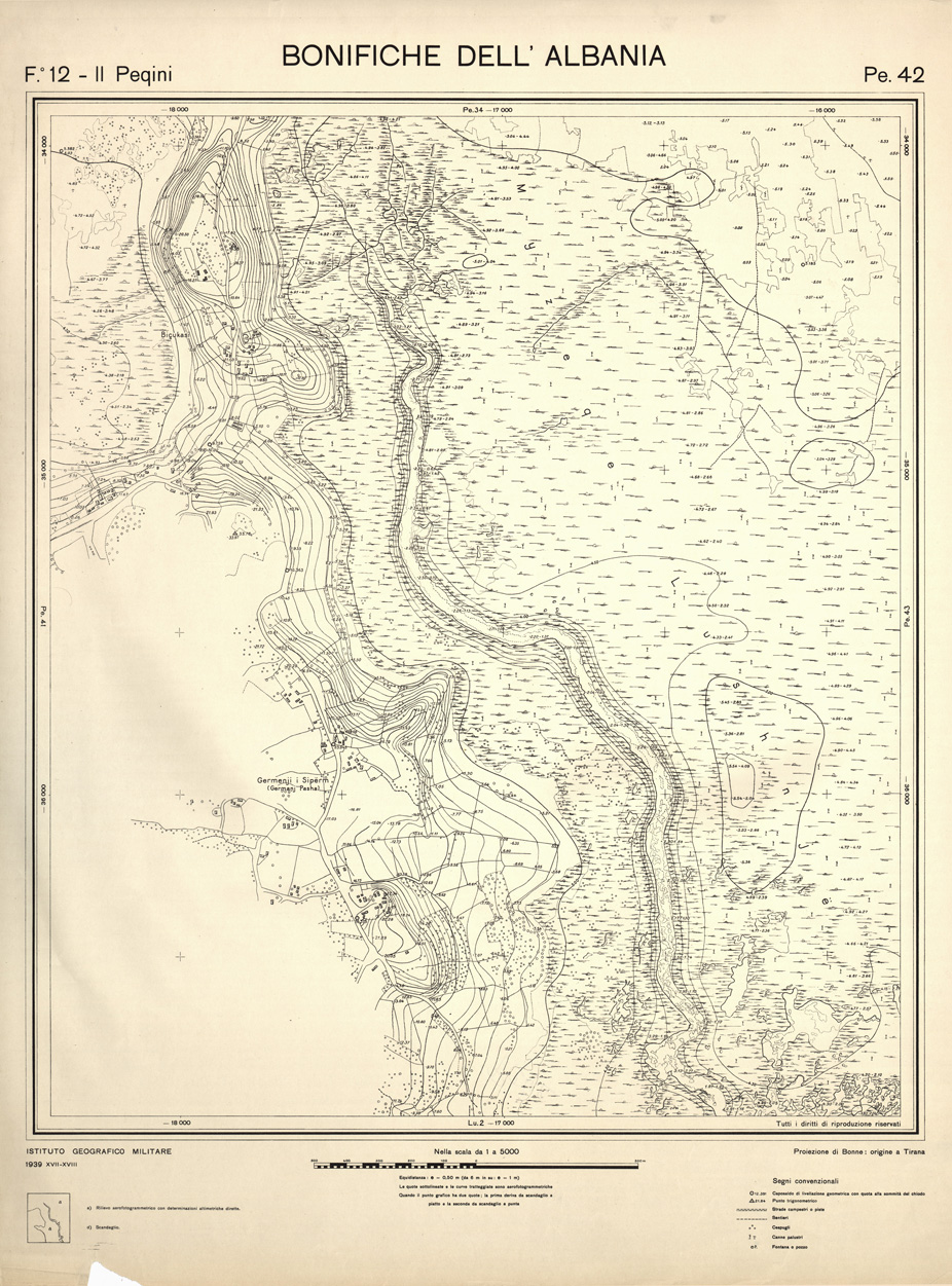 "Rilievi effettuati dall' IGM negli anni dal 1939 al 1943 per conto dell' Ente per le Bonifiche Albanesi istituito dal Ministero Esteri - Sottosegretariato Affari Albanesi."