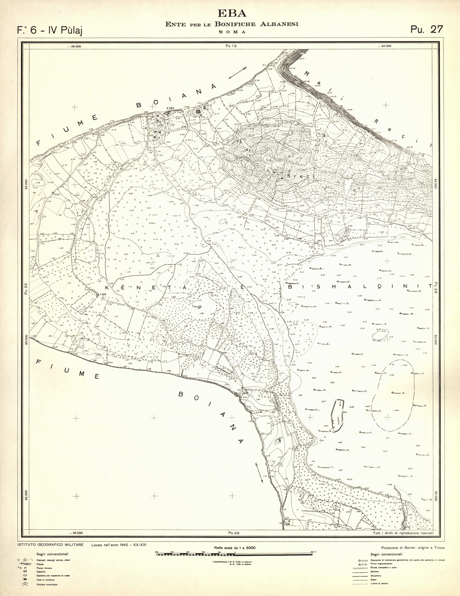 "Rilievi effettuati dall' IGM negli anni dal 1939 al 1943 per conto dell' Ente per le Bonifiche Albanesi istituito dal Ministero Esteri - Sottosegretariato Affari Albanesi."