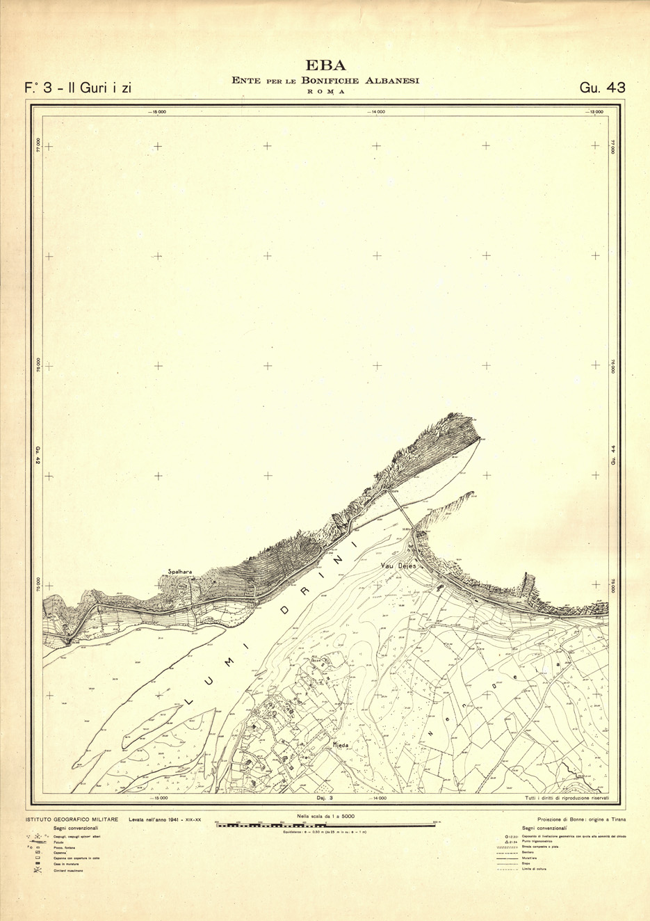 "Rilievi effettuati dall' IGM negli anni dal 1939 al 1943 per conto dell' Ente per le Bonifiche Albanesi istituito dal Ministero Esteri - Sottosegretariato Affari Albanesi."