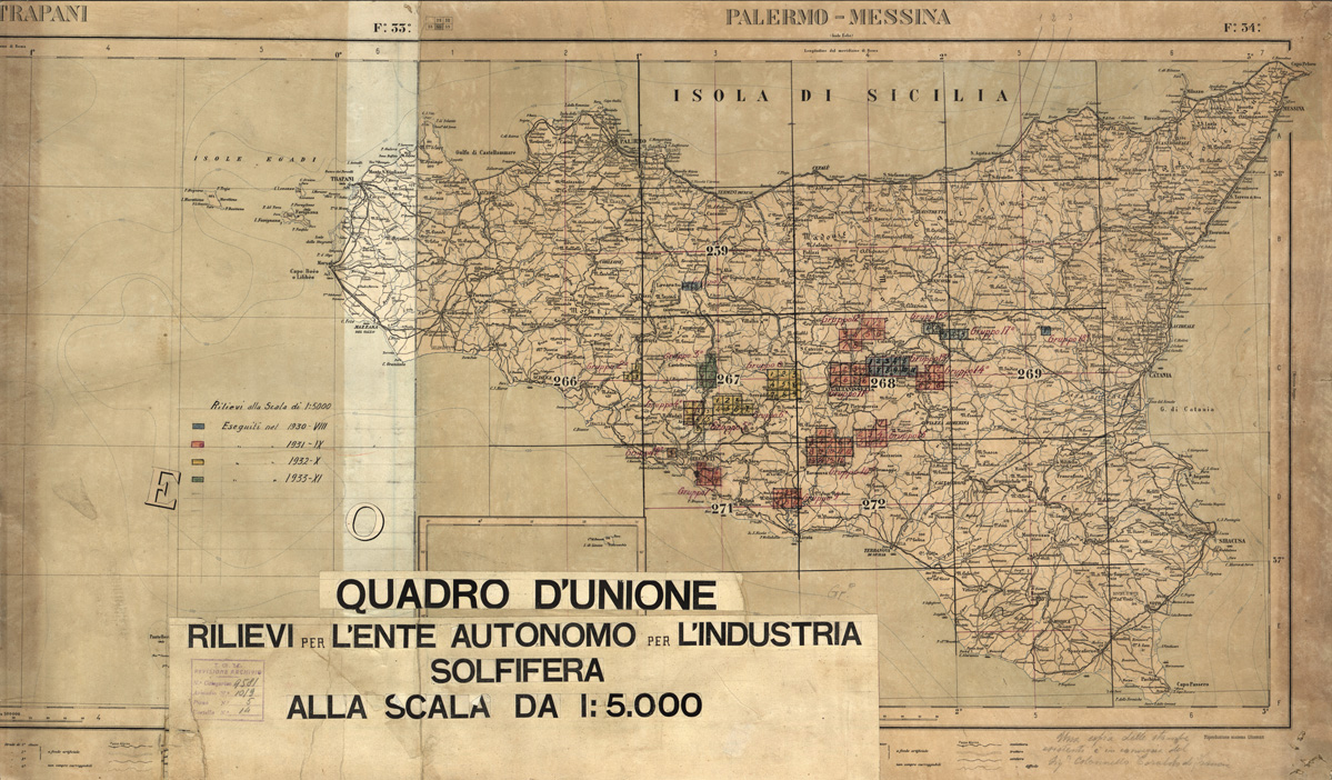 "Carta realizzata e pubblicata dall' IGM per conto dell' Ente Autonomo per l' Industria Solfifera, i rilievi furono eseguiti negli anni dal 1930 al 1933 e utilizzati in seguito anche per il completamento delle tavolette alla scala di 1:25.000 della Carta d' Italia."