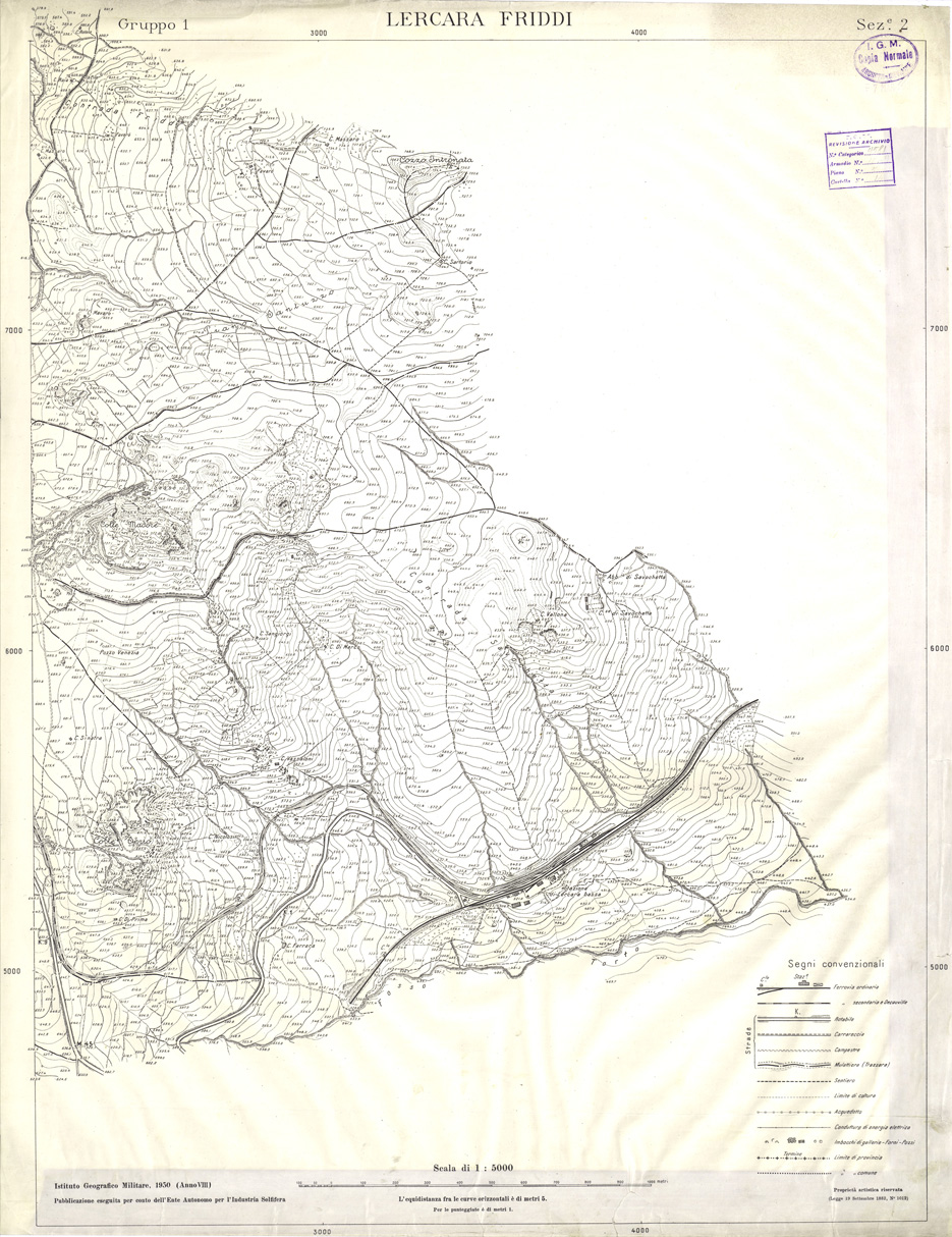 "Carta realizzata e pubblicata dall' IGM per conto dell' Ente Autonomo per l' Industria Solfifera, i rilievi furono eseguiti negli anni dal 1930 al 1933 e utilizzati in seguito anche per il completamento delle tavolette alla scala di 1:25.000 della Carta d' Italia."