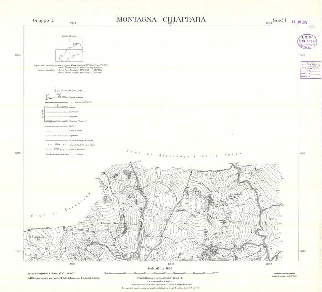 "Carta realizzata e pubblicata dall' IGM per conto dell' Ente Autonomo per l' Industria Solfifera, i rilievi furono eseguiti negli anni dal 1930 al 1933 e utilizzati in seguito anche per il completamento delle tavolette alla scala di 1:25.000 della Carta d' Italia."