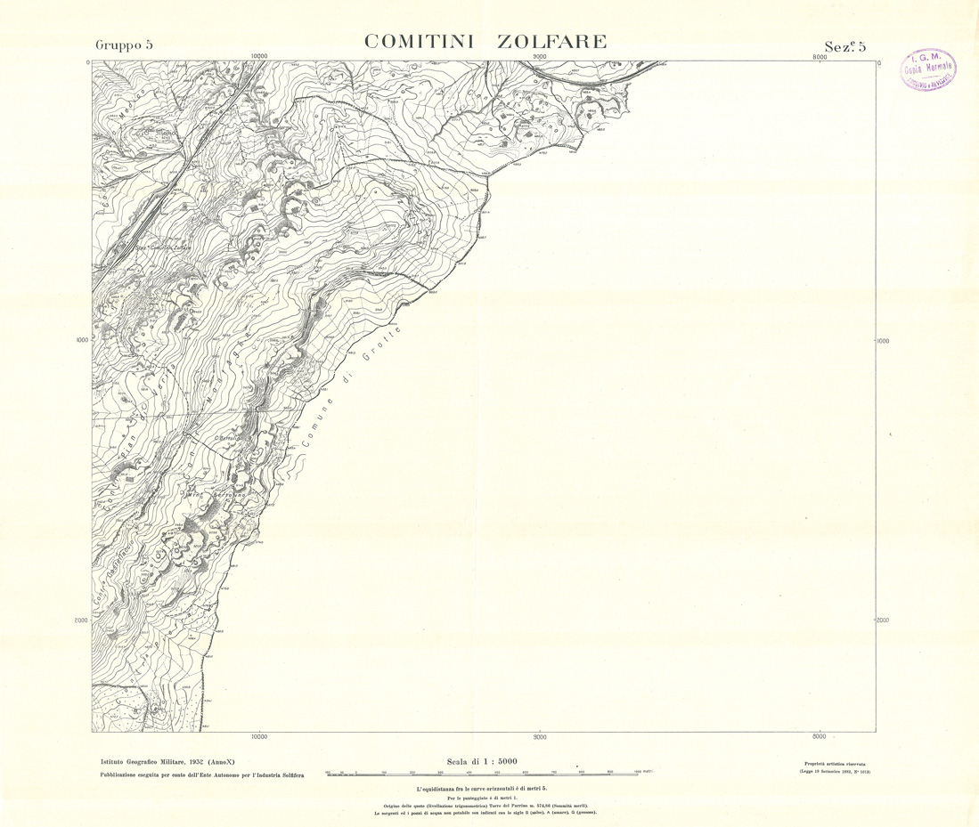 "Carta realizzata e pubblicata dall' IGM per conto dell' Ente Autonomo per l' Industria Solfifera, i rilievi furono eseguiti negli anni dal 1930 al 1933 e utilizzati in seguito anche per il completamento delle tavolette alla scala di 1:25.000 della Carta d' Italia."