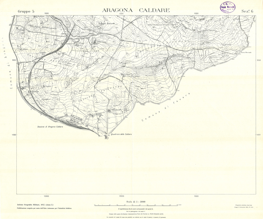 "Carta realizzata e pubblicata dall' IGM per conto dell' Ente Autonomo per l' Industria Solfifera, i rilievi furono eseguiti negli anni dal 1930 al 1933 e utilizzati in seguito anche per il completamento delle tavolette alla scala di 1:25.000 della Carta d' Italia."