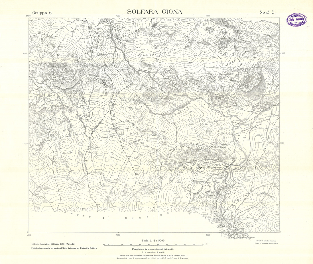 "Carta realizzata e pubblicata dall' IGM per conto dell' Ente Autonomo per l' Industria Solfifera, i rilievi furono eseguiti negli anni dal 1930 al 1933 e utilizzati in seguito anche per il completamento delle tavolette alla scala di 1:25.000 della Carta d' Italia."