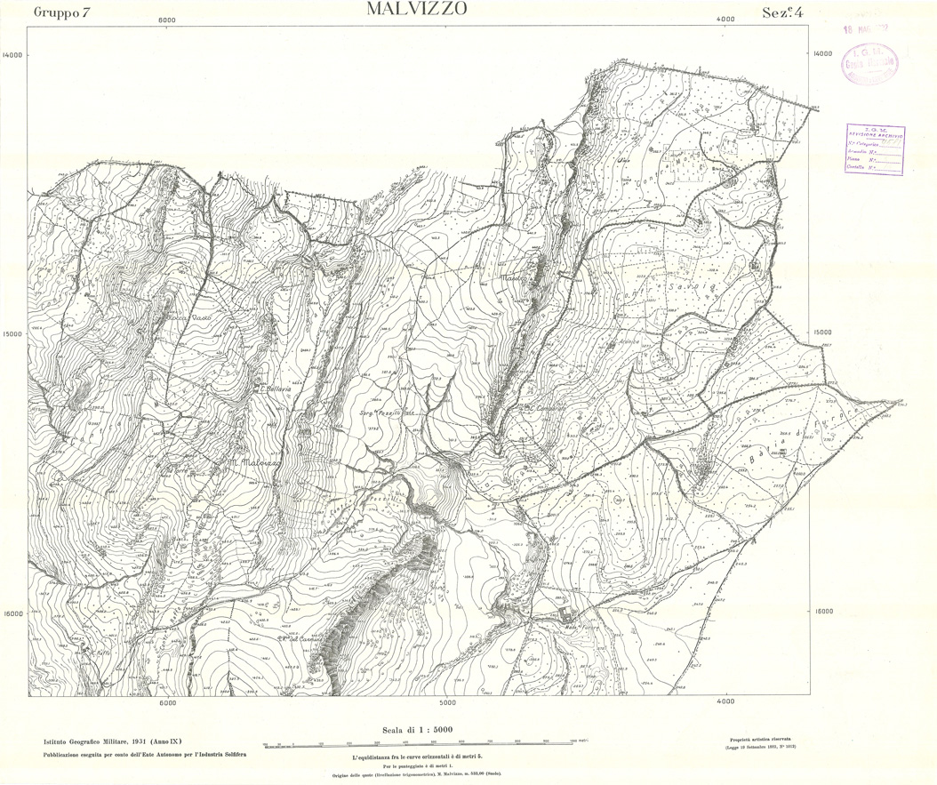 "Carta realizzata e pubblicata dall' IGM per conto dell' Ente Autonomo per l' Industria Solfifera, i rilievi furono eseguiti negli anni dal 1930 al 1933 e utilizzati in seguito anche per il completamento delle tavolette alla scala di 1:25.000 della Carta d' Italia."