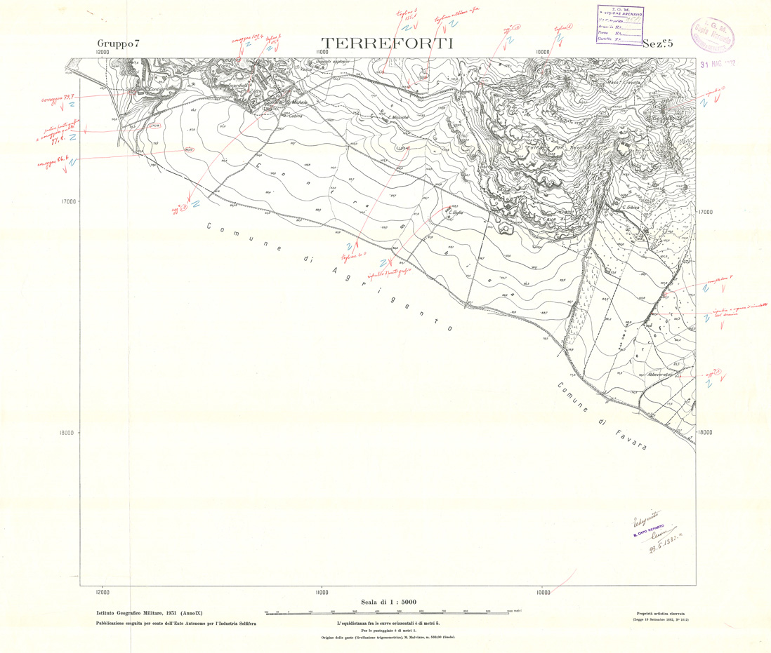 "Carta realizzata e pubblicata dall' IGM per conto dell' Ente Autonomo per l' Industria Solfifera, i rilievi furono eseguiti negli anni dal 1930 al 1933 e utilizzati in seguito anche per il completamento delle tavolette alla scala di 1:25.000 della Carta d' Italia."