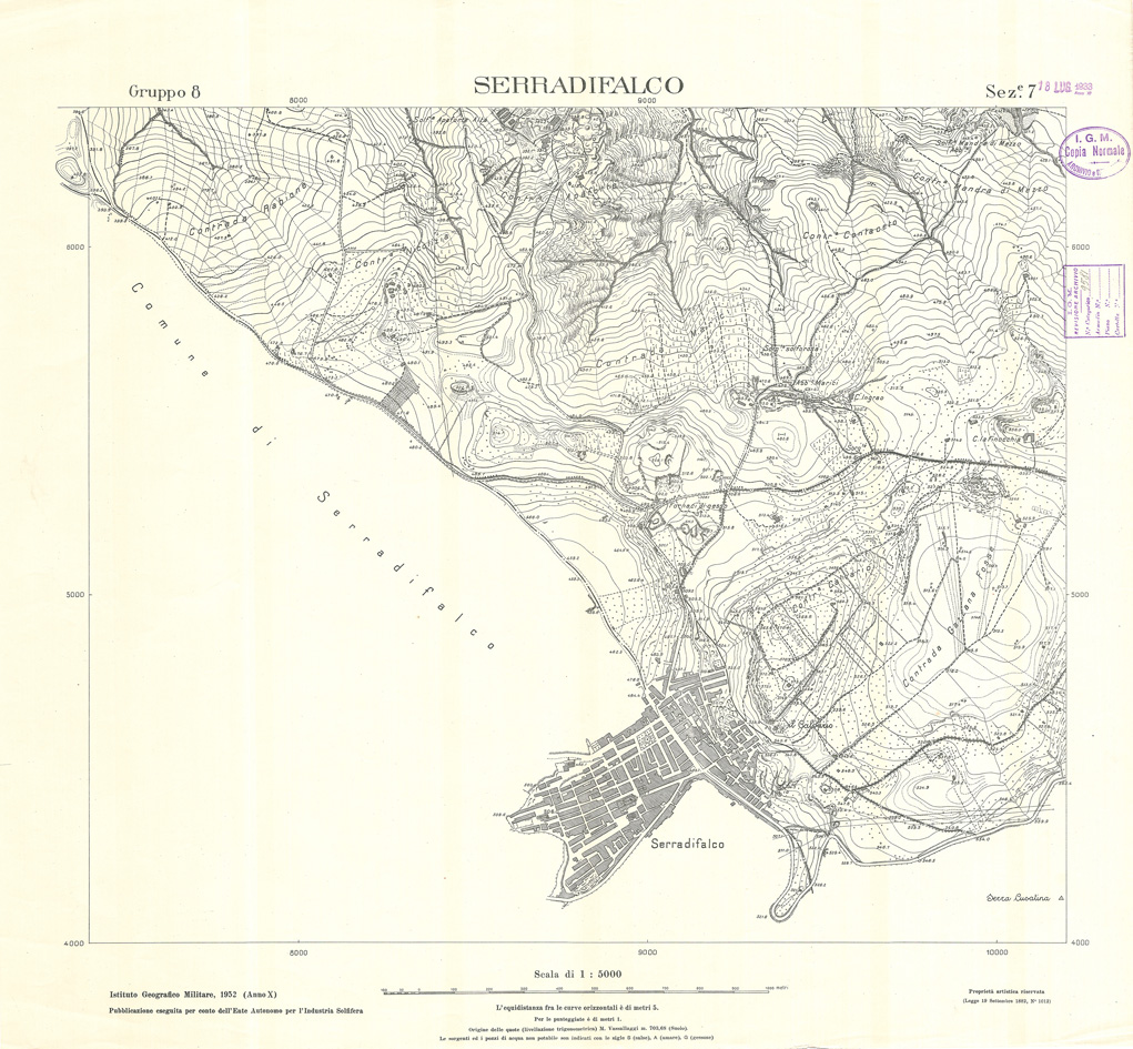 "Carta realizzata e pubblicata dall' IGM per conto dell' Ente Autonomo per l' Industria Solfifera, i rilievi furono eseguiti negli anni dal 1930 al 1933 e utilizzati in seguito anche per il completamento delle tavolette alla scala di 1:25.000 della Carta d' Italia."