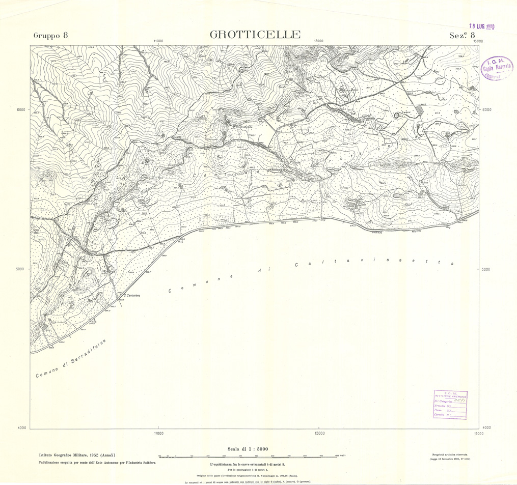 "Carta realizzata e pubblicata dall' IGM per conto dell' Ente Autonomo per l' Industria Solfifera, i rilievi furono eseguiti negli anni dal 1930 al 1933 e utilizzati in seguito anche per il completamento delle tavolette alla scala di 1:25.000 della Carta d' Italia."