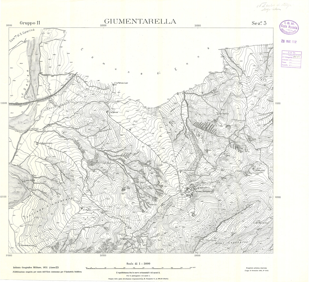 "Carta realizzata e pubblicata dall' IGM per conto dell' Ente Autonomo per l' Industria Solfifera, i rilievi furono eseguiti negli anni dal 1930 al 1933 e utilizzati in seguito anche per il completamento delle tavolette alla scala di 1:25.000 della Carta d' Italia."