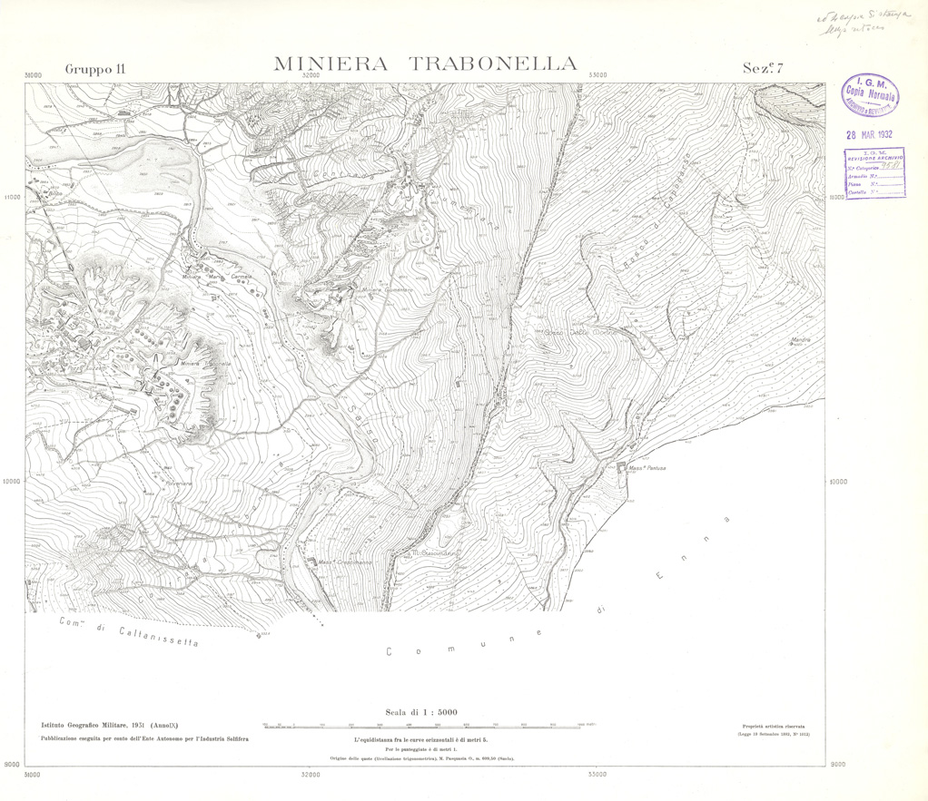 "Carta realizzata e pubblicata dall' IGM per conto dell' Ente Autonomo per l' Industria Solfifera, i rilievi furono eseguiti negli anni dal 1930 al 1933 e utilizzati in seguito anche per il completamento delle tavolette alla scala di 1:25.000 della Carta d' Italia."