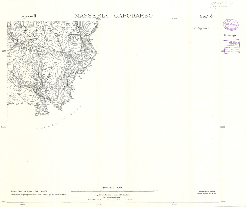 "Carta realizzata e pubblicata dall' IGM per conto dell' Ente Autonomo per l' Industria Solfifera, i rilievi furono eseguiti negli anni dal 1930 al 1933 e utilizzati in seguito anche per il completamento delle tavolette alla scala di 1:25.000 della Carta d' Italia."