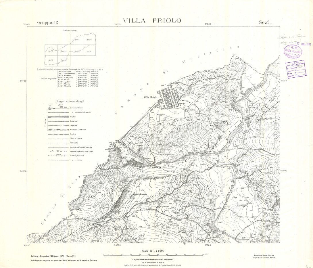 "Carta realizzata e pubblicata dall' IGM per conto dell' Ente Autonomo per l' Industria Solfifera, i rilievi furono eseguiti negli anni dal 1930 al 1933 e utilizzati in seguito anche per il completamento delle tavolette alla scala di 1:25.000 della Carta d' Italia."