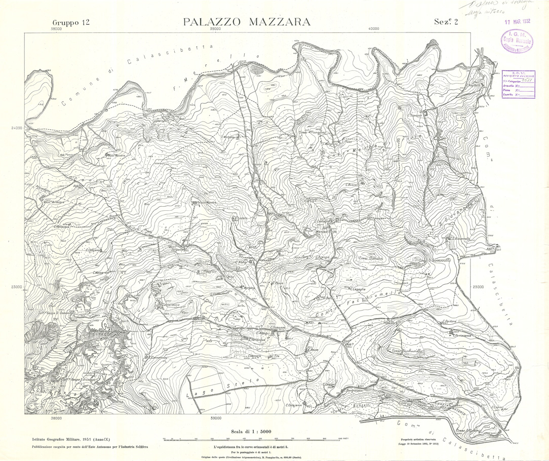 "Carta realizzata e pubblicata dall' IGM per conto dell' Ente Autonomo per l' Industria Solfifera, i rilievi furono eseguiti negli anni dal 1930 al 1933 e utilizzati in seguito anche per il completamento delle tavolette alla scala di 1:25.000 della Carta d' Italia."