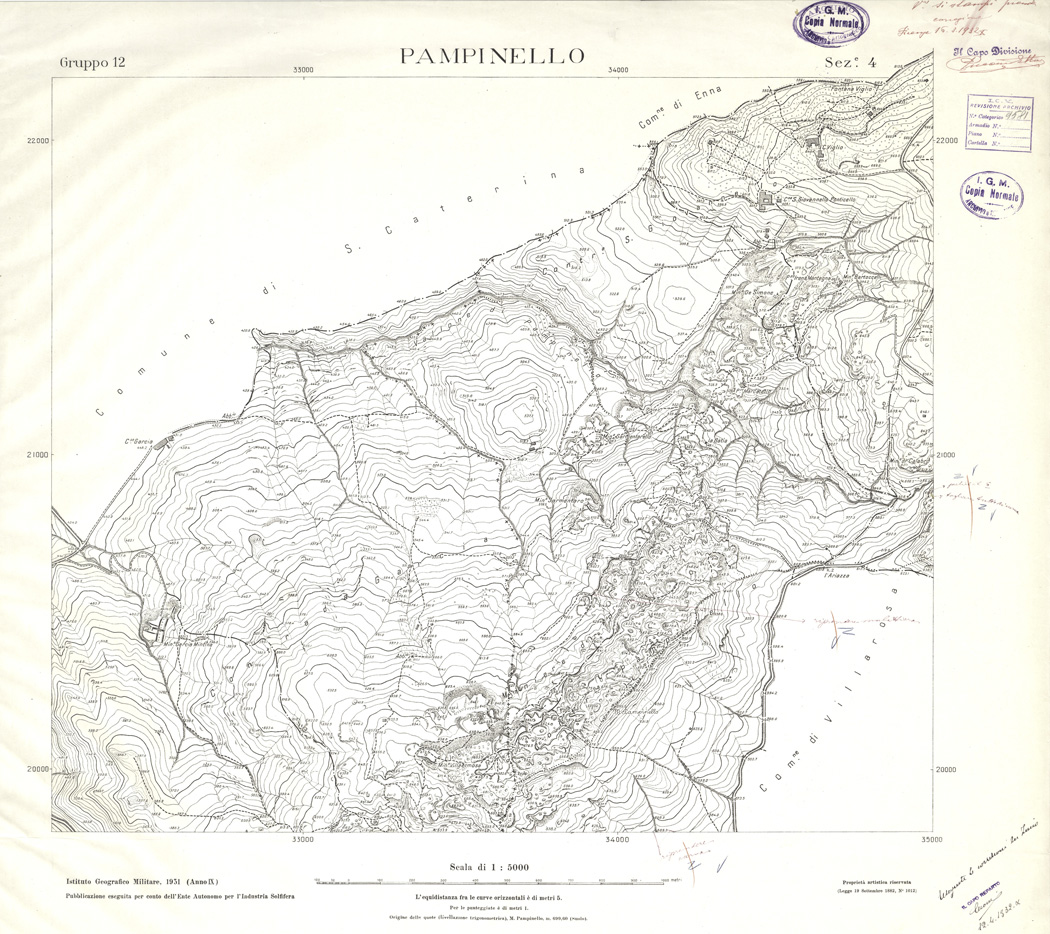 "Carta realizzata e pubblicata dall' IGM per conto dell' Ente Autonomo per l' Industria Solfifera, i rilievi furono eseguiti negli anni dal 1930 al 1933 e utilizzati in seguito anche per il completamento delle tavolette alla scala di 1:25.000 della Carta d' Italia."