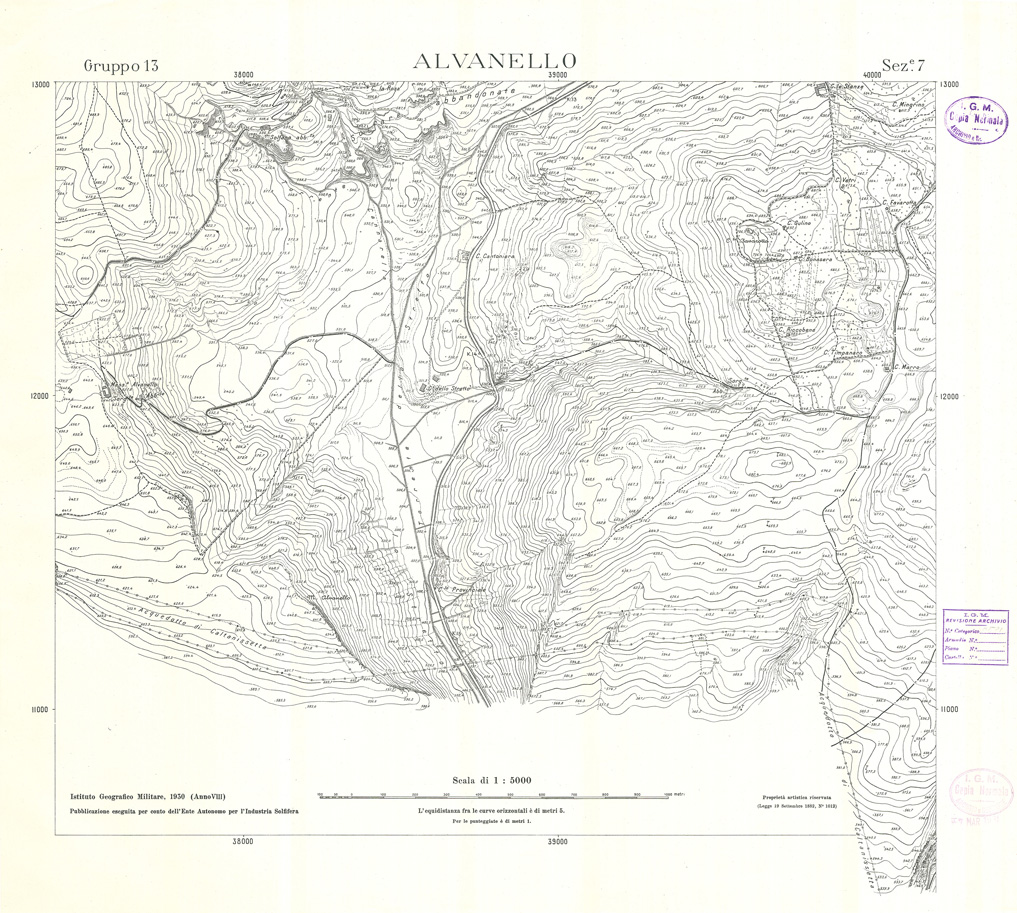 "Carta realizzata e pubblicata dall' IGM per conto dell' Ente Autonomo per l' Industria Solfifera, i rilievi furono eseguiti negli anni dal 1930 al 1933 e utilizzati in seguito anche per il completamento delle tavolette alla scala di 1:25.000 della Carta d' Italia."