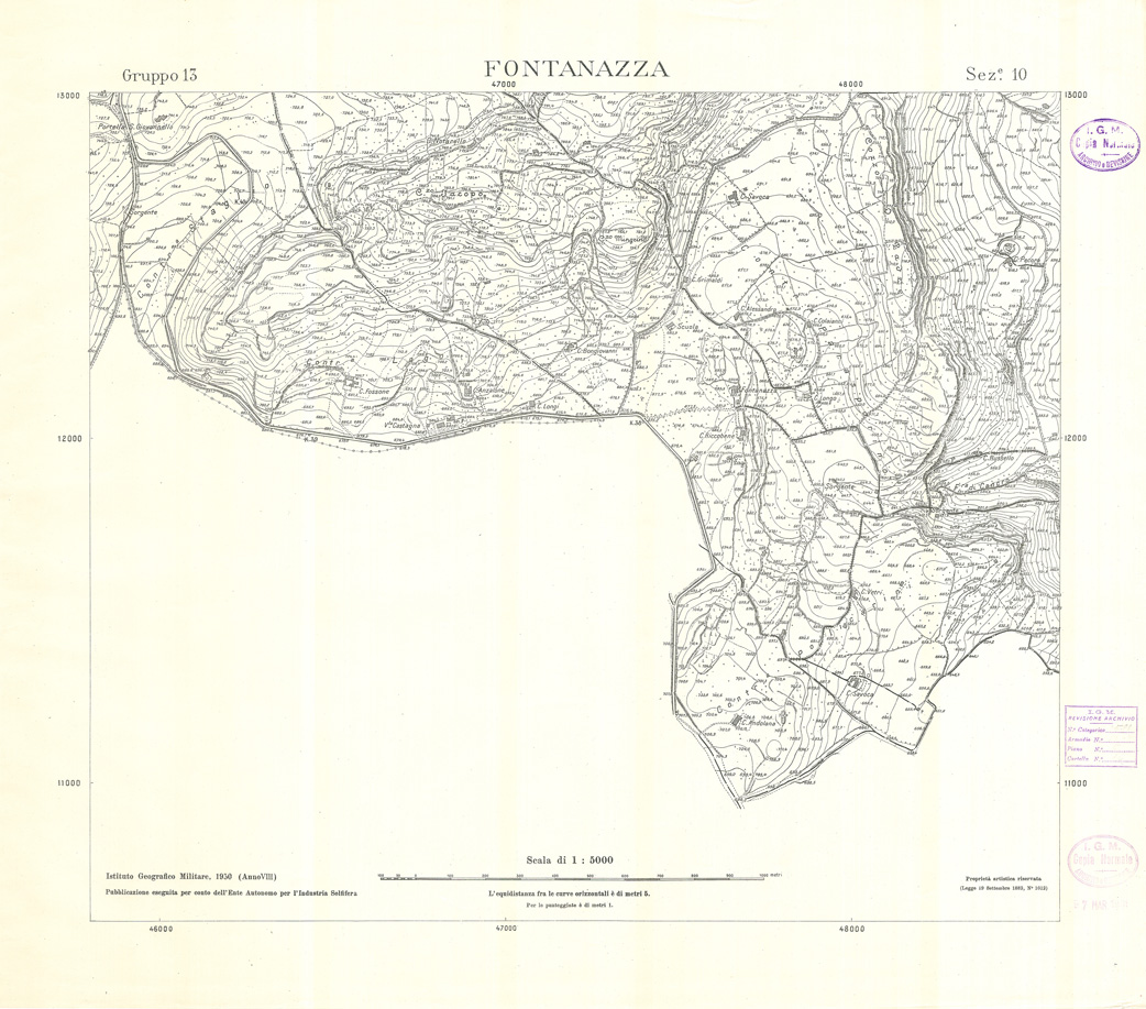 "Carta realizzata e pubblicata dall' IGM per conto dell' Ente Autonomo per l' Industria Solfifera, i rilievi furono eseguiti negli anni dal 1930 al 1933 e utilizzati in seguito anche per il completamento delle tavolette alla scala di 1:25.000 della Carta d' Italia."