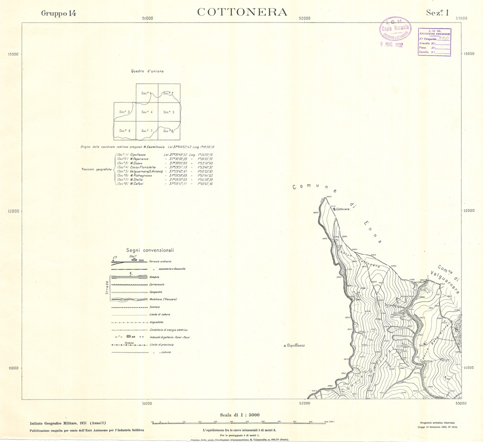"Carta realizzata e pubblicata dall' IGM per conto dell' Ente Autonomo per l' Industria Solfifera, i rilievi furono eseguiti negli anni dal 1930 al 1933 e utilizzati in seguito anche per il completamento delle tavolette alla scala di 1:25.000 della Carta d' Italia."