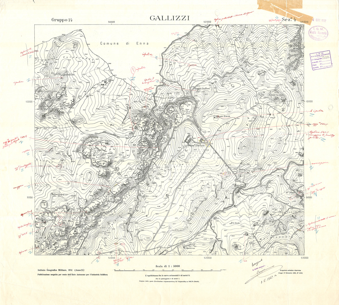 "Carta realizzata e pubblicata dall' IGM per conto dell' Ente Autonomo per l' Industria Solfifera, i rilievi furono eseguiti negli anni dal 1930 al 1933 e utilizzati in seguito anche per il completamento delle tavolette alla scala di 1:25.000 della Carta d' Italia."