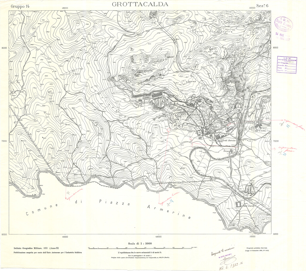 "Carta realizzata e pubblicata dall' IGM per conto dell' Ente Autonomo per l' Industria Solfifera, i rilievi furono eseguiti negli anni dal 1930 al 1933 e utilizzati in seguito anche per il completamento delle tavolette alla scala di 1:25.000 della Carta d' Italia."