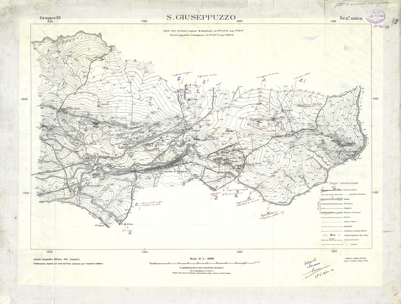 "Carta realizzata e pubblicata dall' IGM per conto dell' Ente Autonomo per l' Industria Solfifera, i rilievi furono eseguiti negli anni dal 1930 al 1933 e utilizzati in seguito anche per il completamento delle tavolette alla scala di 1:25.000 della Carta d' Italia."