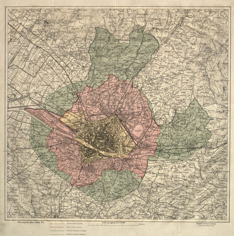 "La carta riporta, con differenti colori, la vecchia e nuova cinta daziaria e i limiti Comunali."